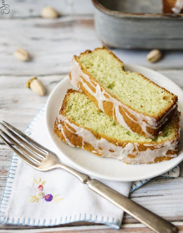 This pistachio pudding pound cake is wonderfully dense and moist inside with a delicate pistachio flavor.